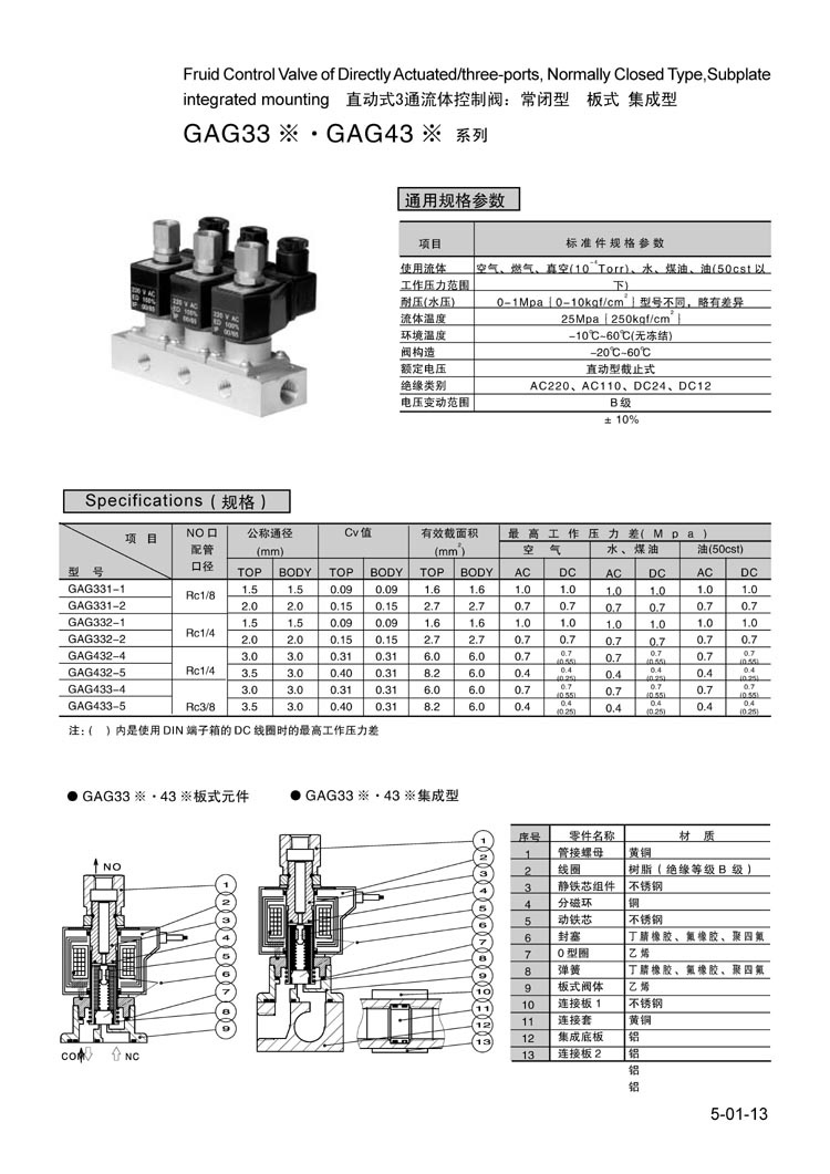 GAG33/43直通式3通阀:常闭型 板式集成型