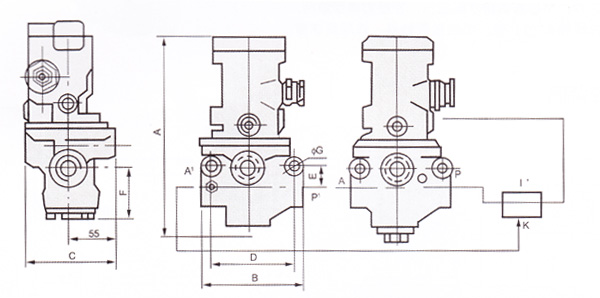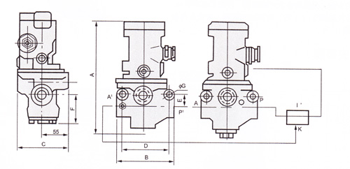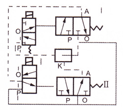 Ⅰ号阀为电控常闭型,Ⅱ号阀为电控常开型,Ⅰ'号阀为气控二通阀。当Ⅱ号阀通电后Aa控制气压消失,这时Ⅰ'号阀控制压力K端压力消失,Ⅰ号阀气源P与自身先导气原相通,Ⅰ号阀在接受电信号后能够工作,当Ⅰ号阀工作后A端输出压力至0,使Ⅱ号阀不能复位,只有在Ⅰ号阀先复位后,Ⅱ号阀才能复位,起到连锁作用。
